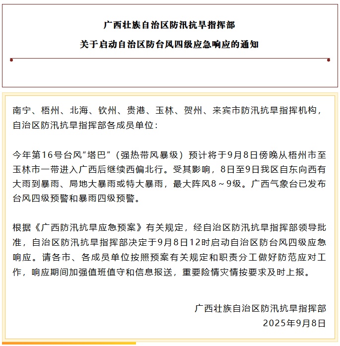 闭路电视新闻:广西周自主地区洪水控制和干旱救济司令部发布了一条通知,预计今年的第16次风暴“胖”(强大的热带风暴水平)将于9月8日晚上从乌林市从乌林市进入广西,并继续向北行驶。它影响了从8到9日,将会有一个大雨季节,当地的大雨或自主地区的向西大雨,最高的阵风为8至9。根据“广西防洪和救济应急计划”的相关规定,批准的自主洪水控制和干旱的自治领导人是自主群控制和干旱缓解疗法的自治,决定在9月8日12:00启动4个紧急情况,以应对4个紧急情况。